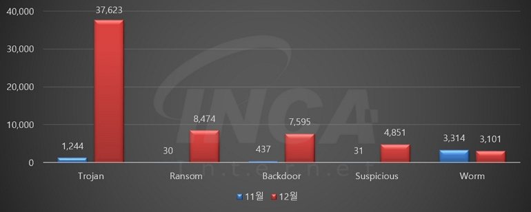 12월에는 악성코드 유형별로 11월과 비교하였을 때 “Worm”을 제외한 유형에서 증가하는 추이를 보였다.