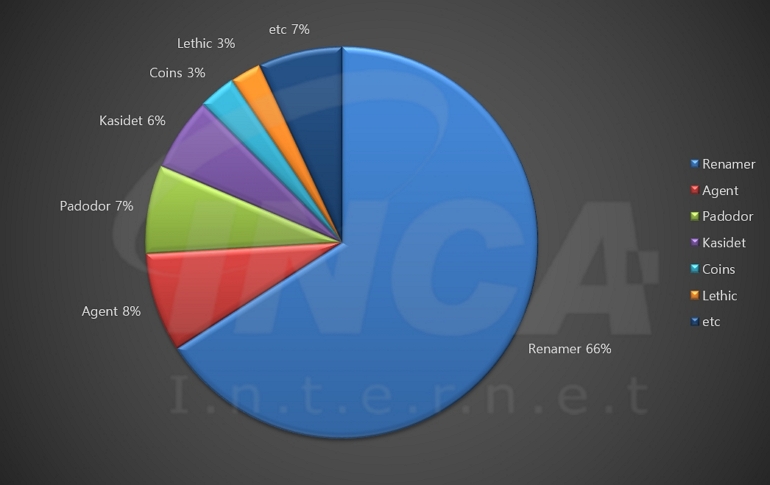 2023년 12월(12월 1일 ~ 12월 31일) 한 달간 잉카인터넷 대응팀은 사용자에게 가장 많이 피해를 준 악성코드 현황을 조사하였으며, 진단명 별로 비교하였을 때 “Renamer”가 66%로 가장 높은 비중을 차지했고, “Agent”와 “Padodor"가 각각 8%와 7%로 그 뒤를 따랐다.
