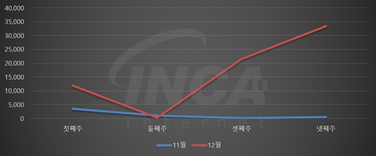 12월 한 달 동안 악성코드 진단 현황을 주 단위로 살펴보았을 때 11월에 비해 둘째 주는 진단 수가 감소했지만 셋째 주부터 다시 증가하는 추이를 보였다.