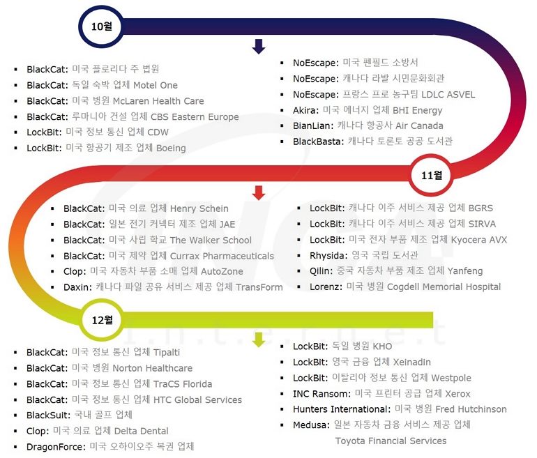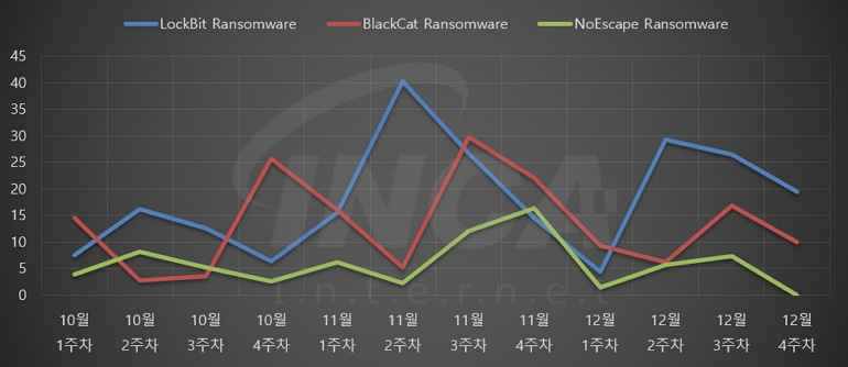 2023년 4분기에는 노이스케이프(NoEscape)와 리시다(Rhysida) 및 헌터스 인터내셔널(Hunters International) 랜섬웨어 등 다양한 랜섬웨어의 피해 사례가 발생했다.