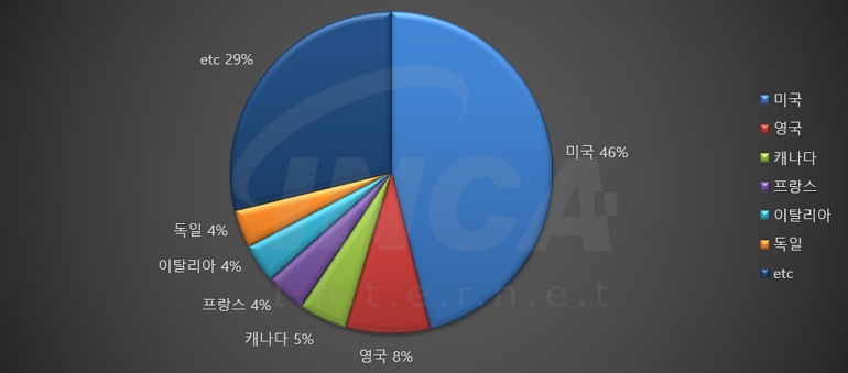 2023년 4분기(10월 1일 ~ 12월 31일)에 발생한 데이터 유출 건을 국가별로 비교했을 때 미국이 46%로 가장 높은 비중을 차지했고, 영국이 8%, 캐나다가 5%로 그 뒤를 따랐다.