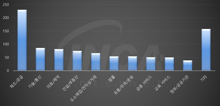2023년 4분기(10월 1일 ~ 12월 31일)에 발생한 데이터 유출 건을 산업별로 비교했을 때 제조/공급 분야가 가장 많은 공격을 받았고, 기술/통신 분야가 그 다음으로 많은 공격을 받았다. 또한, 의료/제약 분야가 그 뒤를 따랐다.