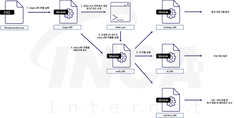 Rhadamanthys 스틸러는 [그림 1]과 같이 코드 인젝션, 분석 방지 및 C&C 서버 통신을 수행하는 각각의 모듈로 구성된다. 분석 방지 모듈의 조건을 통과하면, C&C 서버에서 추가 명령 및 페이로드를 수신한다.