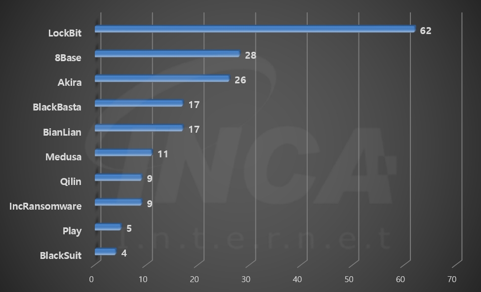 2024년 1월(1월 1일 ~ 1월 31일)에 발생한 데이터 유출 현황을 랜섬웨어 진단명 별로 비교하였을 때 “LockBit” 랜섬웨어가 62건으로 가장 많은 데이터 유출이 있었고, “8Base” 랜섬웨어와 “Akira” 랜섬웨어가 각각 28건과 26건의 유출 사례를 기록했다.