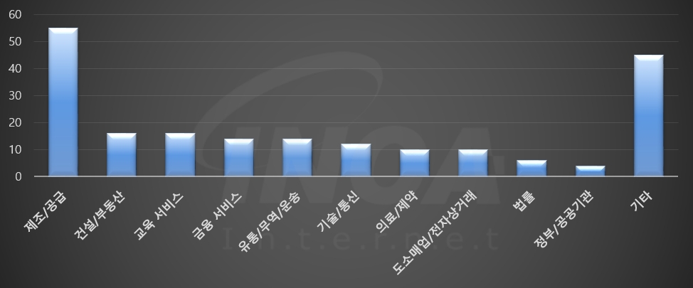 2024년 1월(1월 1일 ~ 1월 31일)에 발생한 데이터 유출 건을 산업별로 비교하였을 때 제조/공급 분야가 가장 많은 공격을 받았고, 건설/부동산 분야가 그 뒤를 따랐다.
