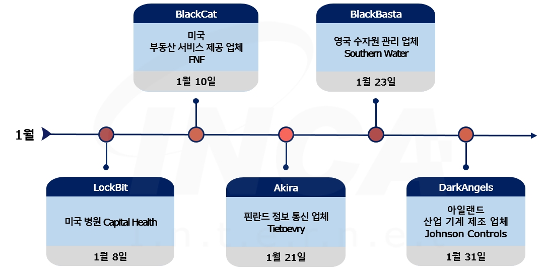 2024년 1월(1월 1일 ~ 1월 31일) 한 달간 랜섬웨어 동향을 조사한 결과, 아일랜드의 산업 기계 제조 업체 Johnson Controls가 "DarkAngels" 랜섬웨어 공격을 받은 이후의 정황을 공개했다. 또한, 미국의 병원 Capital Health와 핀란드의 정보 통신 업체 Tietoevry가 각각 "LockBit"과 "Akira" 랜섬웨어 공격으로 운영이 중단된 정황이 알려졌다. 한편, 미국의 부동산 서비스 제공 업체 FNF와 영국의 수자원 관리 업체 Southern Water는 각각 "BlackCat"과 "BlackBasta" 랜섬웨어의 공격으로 데이터가 유출된 정황이 발견됐다.