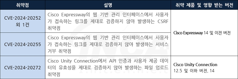 Cisco 사는 제품에서 발생하는 취약점에 대한 보안 업데이트를 발표하고, 관련 취약점을 해결하기 위해 최신 버전으로 업데이트할 것을 권고하였다.