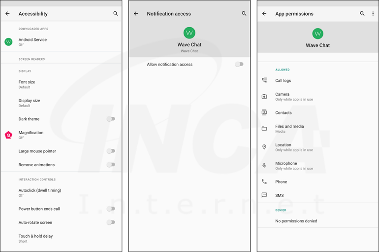 단, 앱이 실행되기 전 먼저 악성 동작에 필요한 접근성 서비스와 알림 서비스 접근 권한을 요청한다. 해당 권한을 획득하면 카메라, 파일 및 위치 등의 권한을 추가로 요청하는데, 이때 접근성 서비스를 악용해 사용자가 원하지 않더라도 권한을 획득한다.