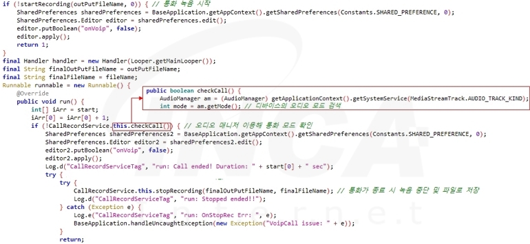그리고, 감염된 디바이스에서 통화 기능이 실행되면 음성을 녹음한 후 파일로 저장한다.