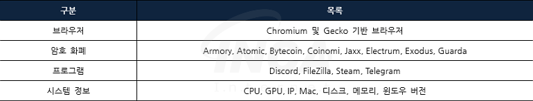 스틸러 페이로드가 실행되면 감염된 호스트에서 브라우저, 암호 화폐 및 프로그램 등에서 민감한 정보를 수집하고, 공격자의 텔레그램 채널로 전송한다.