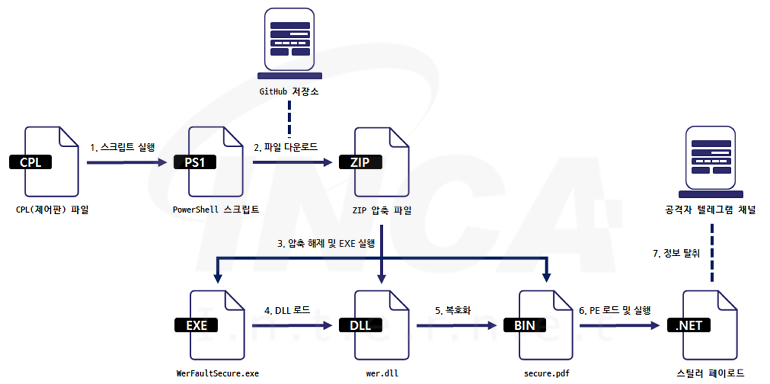 가짜 구인 광고에 포함된 링크에 접속하면 악성 CPL(제어판) 파일이 다운로드되며, 해당 파일은 PowerShell 스크립트를 이용해 공격자의 GitHub 저장소에서 ZIP 파일을 다운로드 후 압축을 해제한다.