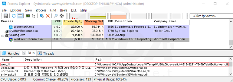 “WerFaultSecure.exe”이 실행되면 [그림 4]와 같이 해당 파일과 같은 폴더에 위치한 “wer.dll”을 로드한다.