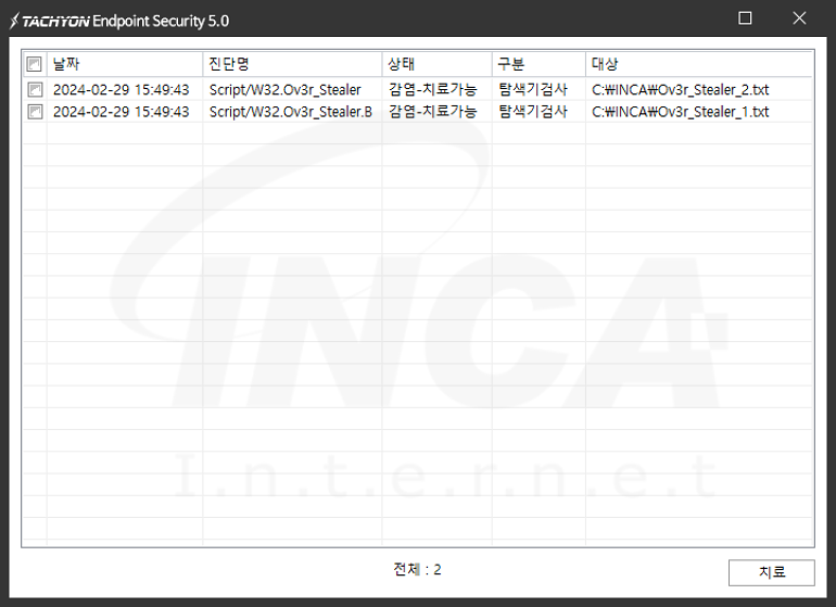 상기 악성코드는 잉카인터넷 안티바이러스 제품 TACHYON Internet Security 5.0에서 진단 및 치료가 가능하다.