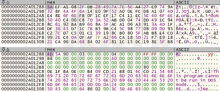 이후, “secure.pdf”에 포함된 데이터를 복호화해 .NET 형식의 스틸러 페이로드를 획득하고, CLR(공용 언어 런타임) 환경을 구성해 스틸러 페이로드를 로드 및 실행한다.
