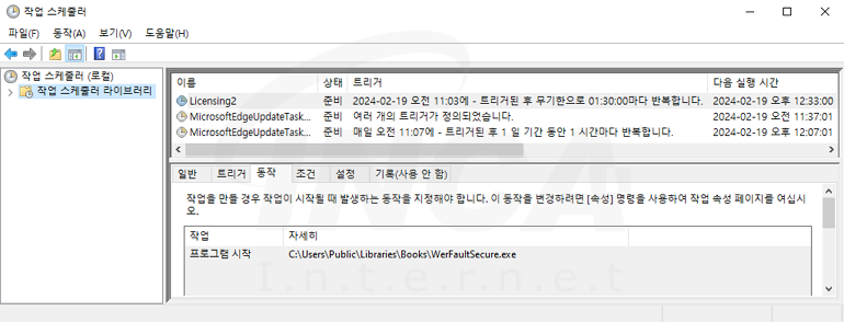 프로세스에 로딩된 “wer.dll”은 먼저, 작업 스케줄러에 90분마다 “WerFaultSecure.exe”를 실행하는 새로운 작업을 등록해 지속성을 획득한다.
