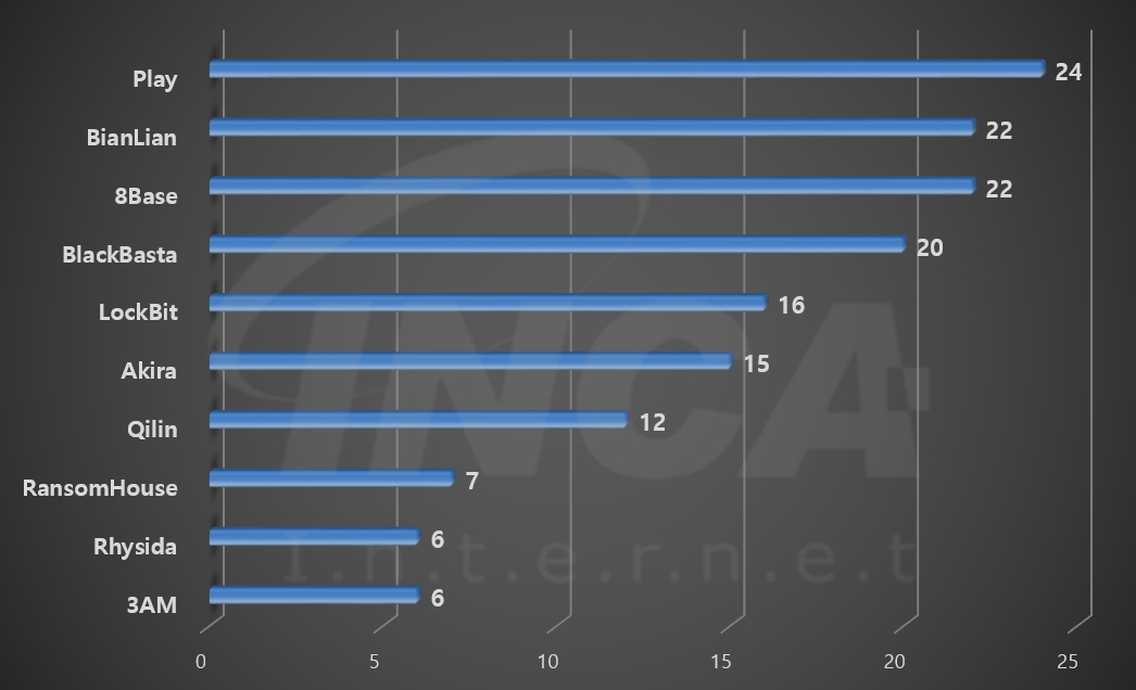 2024년 2월(2월 1일 ~ 2월 29일)에 발생한 데이터 유출 현황을 랜섬웨어 진단명 별로 비교하였을 때 “Play” 랜섬웨어가 24건으로 가장 많은 데이터 유출이 있었고, “BianLian” 랜섬웨어와 “8Base” 랜섬웨어가 22건의 유출 사례를 기록했다.