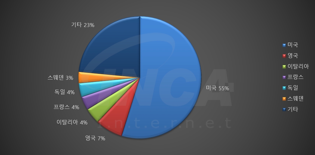2024년 2월(2월 1일 ~ 2월 29일)에 발생한 데이터 유출 건을 국가별로 비교하였을 때 미국이 55%로 가장 높은 비중을 차지했고, 영국이 7%로 그 뒤를 따랐다.