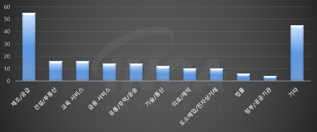2024년 2월(2월 1일 ~ 2월 29일)에 발생한 데이터 유출 건을 산업별로 비교하였을 때 제조/공급 분야가 가장 많은 공격을 받았고, 건설/부동산 분야와 교육 서비스 분야가 그 뒤를 따랐다.