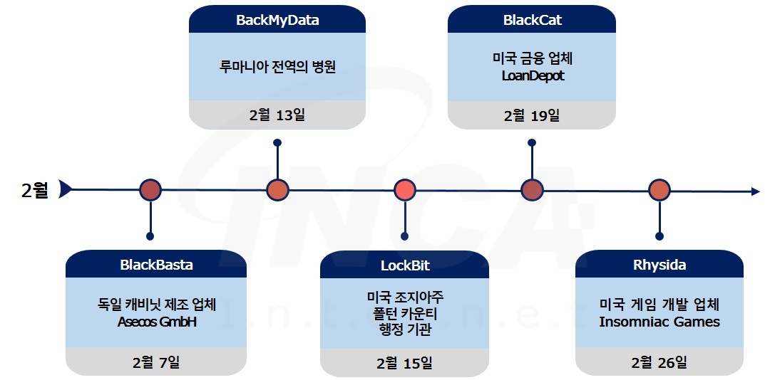 2024년 2월(2월 1일 ~ 2월 29일) 한 달간 랜섬웨어 동향을 조사한 결과, 루마니아 전역의 병원 다수가 "BackMyData" 랜섬웨어 공격으로 운영에 영향을 미쳤다. 또한, 미국 조지아주 폴턴 카운티의 행정 기관과 미국의 금융 업체 LoanDepot에서 발생한 사이버 보안 사고에 각각 "LockBit"과 "BlackCat" 랜섬웨어가 배후자라고 주장하며 나섰다. 한편, 독일의 캐비닛 제조 업체 Asecos GmbH와 미국의 게임 개발 업체 Insomniac Games가 각각 "BlackBasta"와 "Rhysida" 랜섬웨어의 공격으로 데이터가 유출된 정황이 발견됐다.