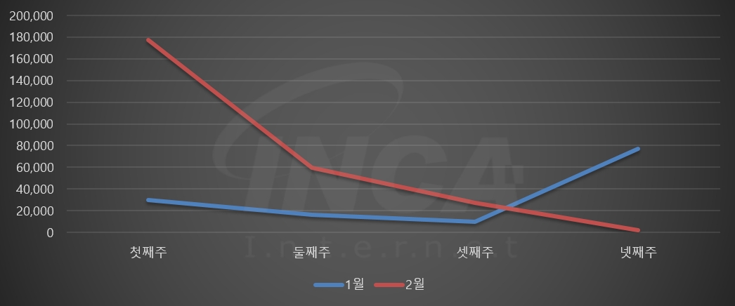 2월 한 달 동안 악성코드 진단 현황을 주 단위로 살펴보았을 때 1월에 비해 셋째를 기점으로 증가에서 감소로 바뀌는 추이를 보였다.