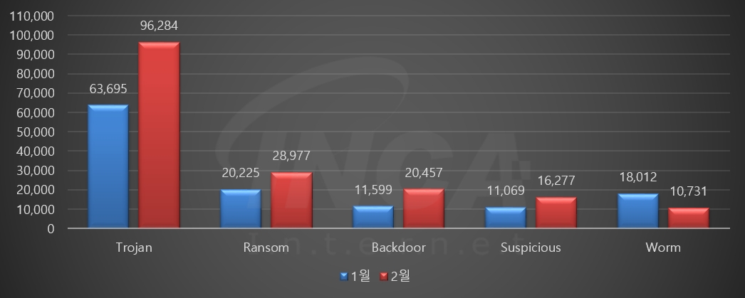 2월에는 악성코드 유형별로 1월과 비교하였을 때 “Worm”을 제외한 유형에서 증가하는 추이를 보였다.