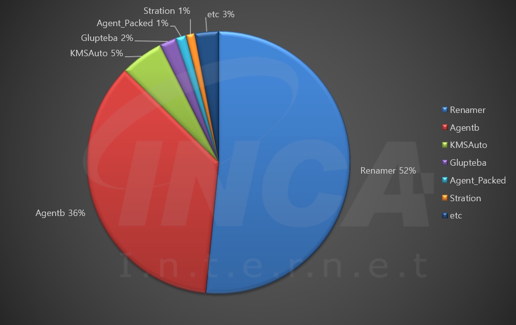 2024년 2월(2월 1일 ~ 2월 29일) 한 달간 잉카인터넷 대응팀은 사용자에게 가장 많이 피해를 준 악성코드 현황을 조사하였으며, 진단명 별로 비교하였을 때 “Renamer”가 52%로 가장 높은 비중을 차지했고, “Agentb”가 36%로 그 뒤를 따랐다.