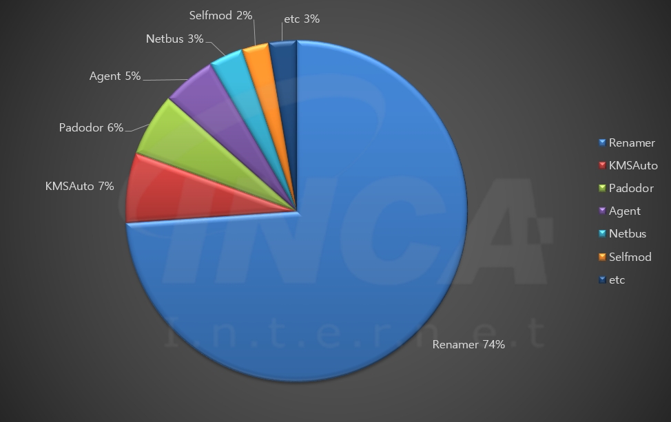 2024년 3월(3월 1일 ~ 3월 31일) 한 달간 잉카인터넷 대응팀은 사용자에게 가장 많이 피해를 준 악성코드 현황을 조사하였으며, 진단명 별로 비교하였을 때 “Renamer”가 74%로 가장 높은 비중을 차지했고, “KMSAuto”와 “Padodor”가 각각 7%와 6%로 그 뒤를 따랐다.