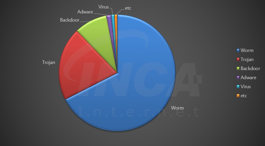3월에 진단한 악성코드를 유형 별로 비교하였을 때 “Worm”의 비중이 가장 높고, “Trojan”과 “Backdoor”가 그 뒤를 따랐다.