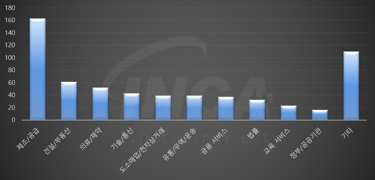 2024년 1분기(1월 1일 ~ 3월 31일)에 발생한 데이터 유출 건을 산업별로 비교했을 때 제조/공급 분야가 가장 많은 공격을 받았고, 건설/부동산 분야가 그 다음으로 많은 공격을 받았다. 또한, 의료/제약 분야가 그 뒤를 따랐다.