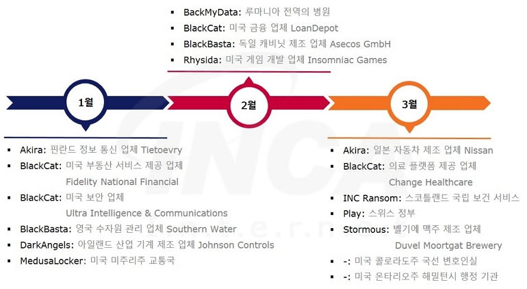 2024년 1분기(1월 1일 ~ 3월 31일) 동안 랜섬웨어 동향을 조사한 결과, 국내/외에서 블랙캣(BlackCat)과 락빗(LockBit) 등의 랜섬웨어로 인한 피해가 다수 발견됐다. 1월에는 미국의 샌드위치 전문 레스토랑 Subway가 락빗 랜섬웨어 공격을 받았고, 2월과 3월에는 미국 금융 업체 LoanDepot과 벨기에의 맥주 제조 업체 Duvel Moortgat Brewery가 각각 블랙캣과 스토머스(Stormous) 랜섬웨어 공격을 받아 피해가 발생했다.