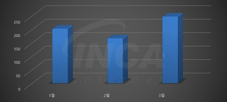 다음은 랜섬웨어 조직이 탈취한 것으로 주장하는 데이터가 게시된 데이터 유출 사이트 44곳의 정보를 취합한 결과이다. 2024년 1분기(1월 1일 ~ 3월 31일)에 발생한 데이터 유출 현황을 월별로 비교하였을 때 3월에 데이터 유출이 가장 많이 발생했다.