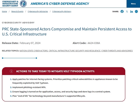 Volt Typhoon이 미국의 주요 인프라에 침투해 발견되기까지 최소 5년이 걸린 소식이 전해졌다. CISA는 Volt Typhoon이 주로 통신과 에너지 및 운송 등의 주요 인프라에 침투했다고 언급했다. 그러나 일반적인 사이버 스파이 활동과는 다른 행보를 보여 시스템을 파괴하는 것이 목적으로 보인다고 덧붙였다.