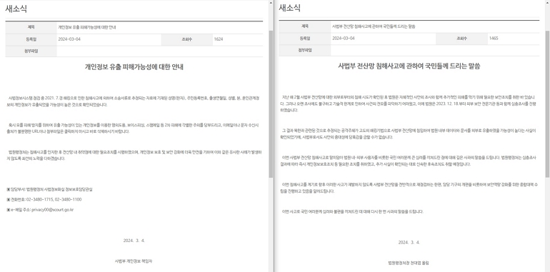 이 외에도 국내 사법부 전산망이 북한 해커 그룹의 공격을 받은 소식이 작년 4분기에 뒤늦게 전해져 논란이 됐다. 당시 공개된 내부 보고서에는 데이터가 유출된 사실이 기재된 것으로 알려졌다. 이에 행정법원처에서는 보안 전문 기관과 함께 조사를 진행할 예정이라고 전한 바가 있다.