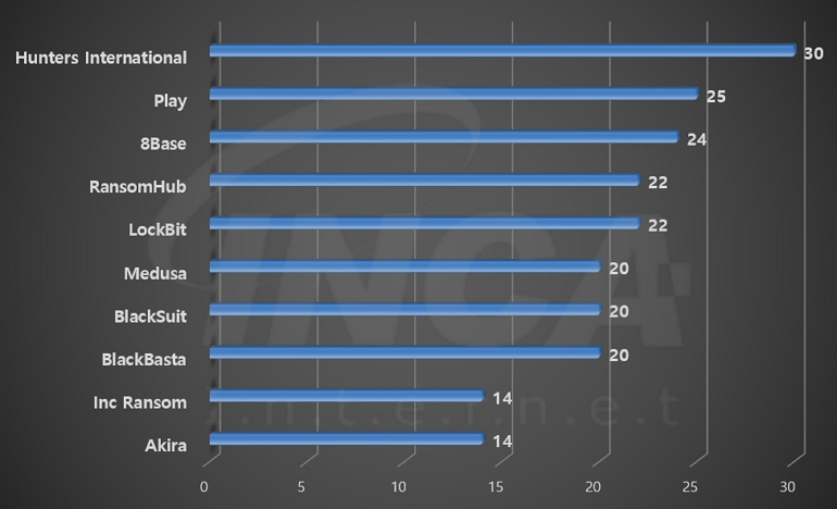 2024년 4월(4월 1일 ~ 4월 30일)에 발생한 데이터 유출 현황을 랜섬웨어 진단명 별로 비교하였을 때 “Hunters International” 랜섬웨어가 30건으로 가장 많은 데이터 유출이 있었고, “Play” 랜섬웨어와 “8Base” 랜섬웨어가 각각 25건과 24건의 유출 사례를 기록했다.