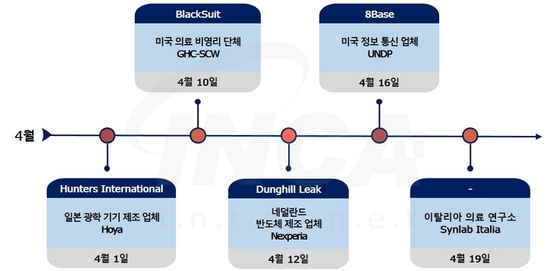 2024년 4월(4월 1일 ~ 4월 30일) 한 달간 랜섬웨어 동향을 조사한 결과, 이탈리아의 의료 연구소 Synlab Italia에서 랜섬웨어 형태의 공격을 받은 소식을 공개했다. 또한, 미국의 의료 비영리 단체 GHC-SCW와 정보 통신 업체 UNDP에서 각각 "BlackSuit"와 "8Base" 랜섬웨어의 공격을 받은 정황이 발견됐다. 한편, 일본의 광학 기기 제조 업체 Hoya와 네덜란드의 반도체 제조 업체 Nexperia는 각각 "Hunters International"과 "Dunghill Leak" 랜섬웨어의 공격을 받은 정황이 알려졌다.