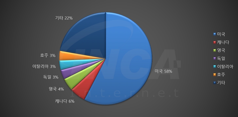 2024년 4월(4월 1일 ~ 4월 30일)에 발생한 데이터 유출 건을 국가별로 비교하였을 때 미국이 58%로 가장 높은 비중을 차지했고, 캐나다와 영국이 각 6%와 4%로 그 뒤를 따랐다.