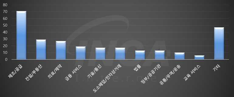 2024년 4월(4월 1일 ~ 4월 30일)에 발생한 데이터 유출 건을 산업별로 비교하였을 때 제조/공급 분야가 가장 많은 공격을 받았고, 건설/부동산 분야와 의료/제약 분야가 그 뒤를 따랐다.