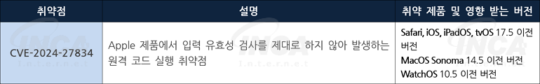 Apple 사는 제품에서 발생하는 취약점에 대한 보안 업데이트를 발표하고, 관련 취약점을 해결하기 위해 최신 버전으로 업데이트할 것을 권고하였다.