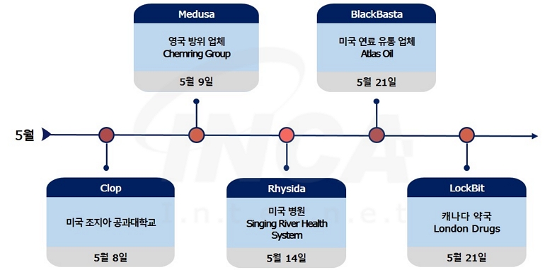 2024년 5월(5월 1일 ~ 5월 31일) 한 달간 랜섬웨어 동향을 조사한 결과, "BlackBasta" 랜섬웨어가 미국의 연료 유통 업체 Atlas Oil을 공격한 정황이 발견됐다. 또한, 영국의 방위 업체 Chemring Group과 캐나다의 약국 London Drugs에서 각각 "Medusa"와 "LockBit" 랜섬웨어의 공격을 받은 정황이 전해졌다. 한편, 미국의 조지아 공과대학교와 미국의 병원 Singing River Health System은 각각 "Clop"과 "Rhysida"의 공격으로 데이터가 유출된 정황이 알려졌다.