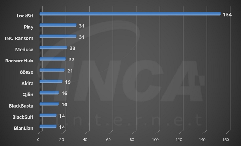 2024년 5월(5월 1일 ~ 5월 31일)에 발생한 데이터 유출 현황을 랜섬웨어 진단명 별로 비교하였을 때 “LockBit” 랜섬웨어가 154건으로 가장 많은 데이터 유출이 있었고, “Play” 랜섬웨어와 “INC Ransom” 랜섬웨어가 31건의 유출 사례를 기록했다.