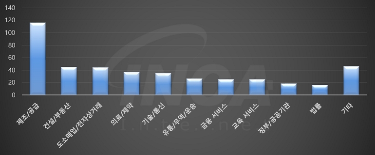2024년 5월(5월 1일 ~ 5월 31일)에 발생한 데이터 유출 건을 산업별로 비교하였을 때 제조/공급 분야가 가장 많은 공격을 받았고, 건설/부동산 분야와 도소매업/전자상거래 분야가 그 뒤를 따랐다.