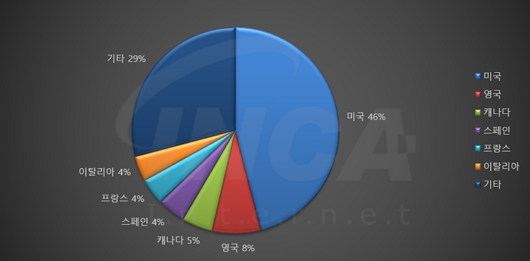 2024년 5월(5월 1일 ~ 5월 31일)에 발생한 데이터 유출 건을 국가별로 비교하였을 때 미국이 46%로 가장 높은 비중을 차지했고, 영국과 캐나다가 각 8%와 5%로 그 뒤를 따랐다.