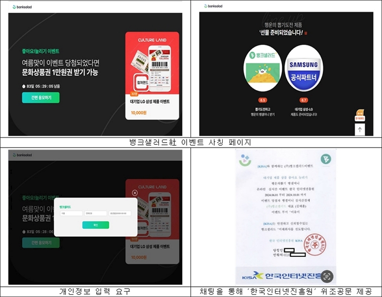 사칭 스미싱에는 공격자가 제작한 피싱 페이지로 연결되는 링크가 있으며, 사용자가 접속할 경우에 개인정보를 입력하도록 유도한다고 전했다. 이후, 이벤트에 당첨돼 당첨금을 수령해야 한다는 빌미로 금융 정보 등의 추가 입력을 요구한다고 덧붙였다. 이 과정에서 공격자는 한국인터넷진흥원에서 작성한 것으로 위장한 위조 공문을 사용자에게 제공한다고 언급했다.