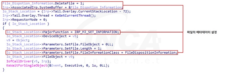 “IObitUnlockers” 서비스는 대상 파일의 오브젝트에 IRP(I/O Request Packet)를 전달해 “IRP_MJ_SET_INFORMATION” 작업을 수행하도록 요청한다. 해당 작업은 파일의 메타데이터를 수정할 수 있으며, 그중에서 “FILE_DISPOSITION_INFO RMATION” 구조체의 “DeleteFile” 멤버를 TRUE로 설정하면 파일의 핸들이 닫힐 때 대상 파일이 삭제된다.