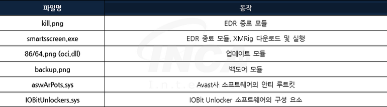 하기의 [표 1]은 “get.png”에서 다운로드하는 “GhostEngine” 모듈의 목록으로 크게 EDR 종료 모듈, 업데이트 모듈 및 백도어 모듈로 구성되며, EDR 종료에 사용되는 윈도우 드라이버와 “XMRig”를 다운로드 및 실행하는 파일을 포함한다.