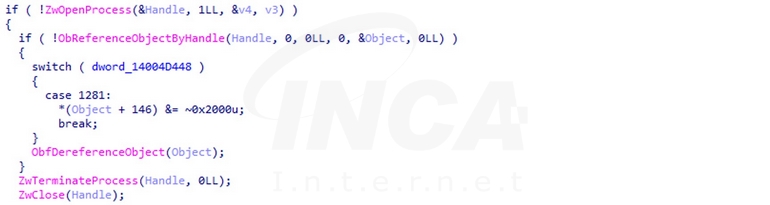 프로세스 ID를 전달받은 aswArPots 서비스는 “ZwTerminateProcess”를 호출해 프로세스를 종료한다.