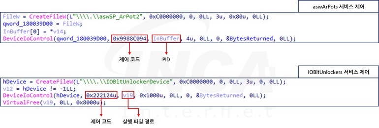 종료 대상 프로세스를 발견하면 “DeviceIoControl” API를 이용해 서비스 제어 코드와 관련 정보를 보낸다. 이 과정에서 aswArPots 서비스에는 제어 코드(0x9988C094)와 대상 프로세스 ID를 전달하고, 종료 대상 프로세스의 실행 파일이 ‘C:\Program Files’ 경로에 존재하면 IOBitUnlockers 서비스에 제어 코드(0x221224)와 실행 경로를 전달한다.